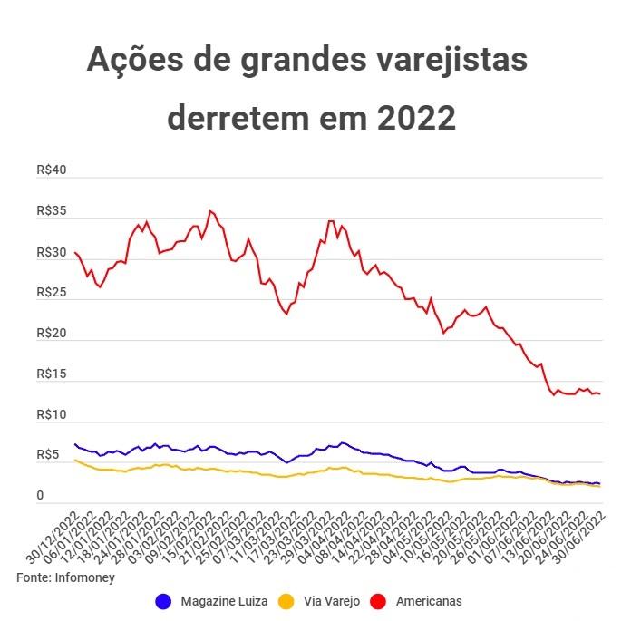 Somente entre os meses de janeiro e junho, os papéis do Magazine Luiza (-67,59%, de R$ 7,22 para R$ 2,34), da Meliuz (-66,67%, de R$ 3,24 para R$ 1,08), da Via Varejo, dona da rede de lojas Casas Bahia e Ponto Frio (-63,43%, de R$ 5,25 para R$ 2,09), e da Americanas (-56,4%,de R$ 30,80 para R$ 13,44) representaram quatro das maiores perdas do principal índice acionário do Brasil.