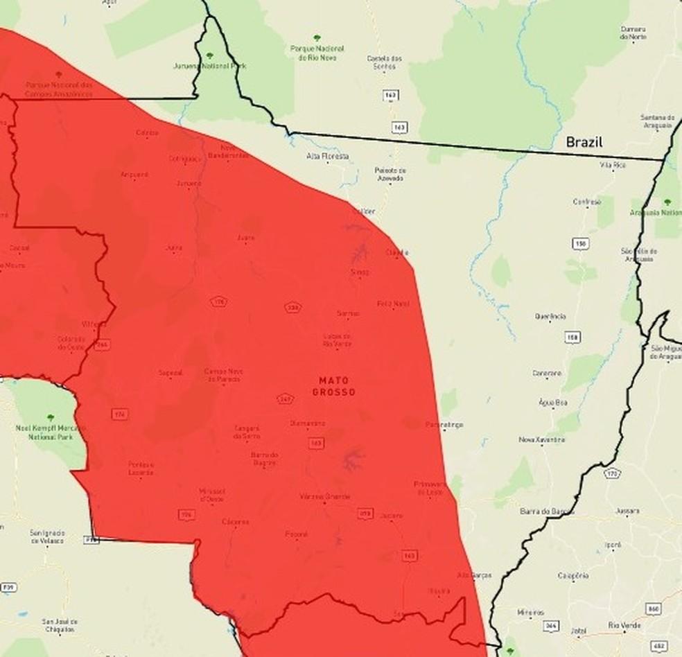 O Instituto Nacional de Meteorologia emitiu alerta de perigo para tempestades em 101 municípios de Mato Grosso, nesta quarta-feira (17).