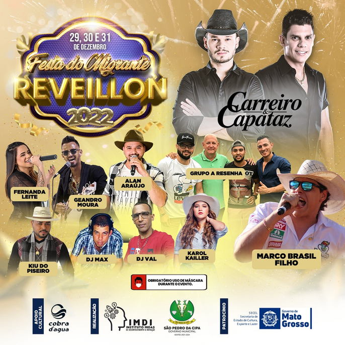 A prefeitura de São Pedro da Cipa (distante 153,8 km de Cuiabá) confirmou a realização da tradicional Festa do Migrante em 2021. Serão três dias de muita música e diversão a partir de 29 de dezembro até a virada do ano no dia 31. No cardápio de atrações dois shows nacionais e sete regionais que valorizam a cultura mato-grossense.