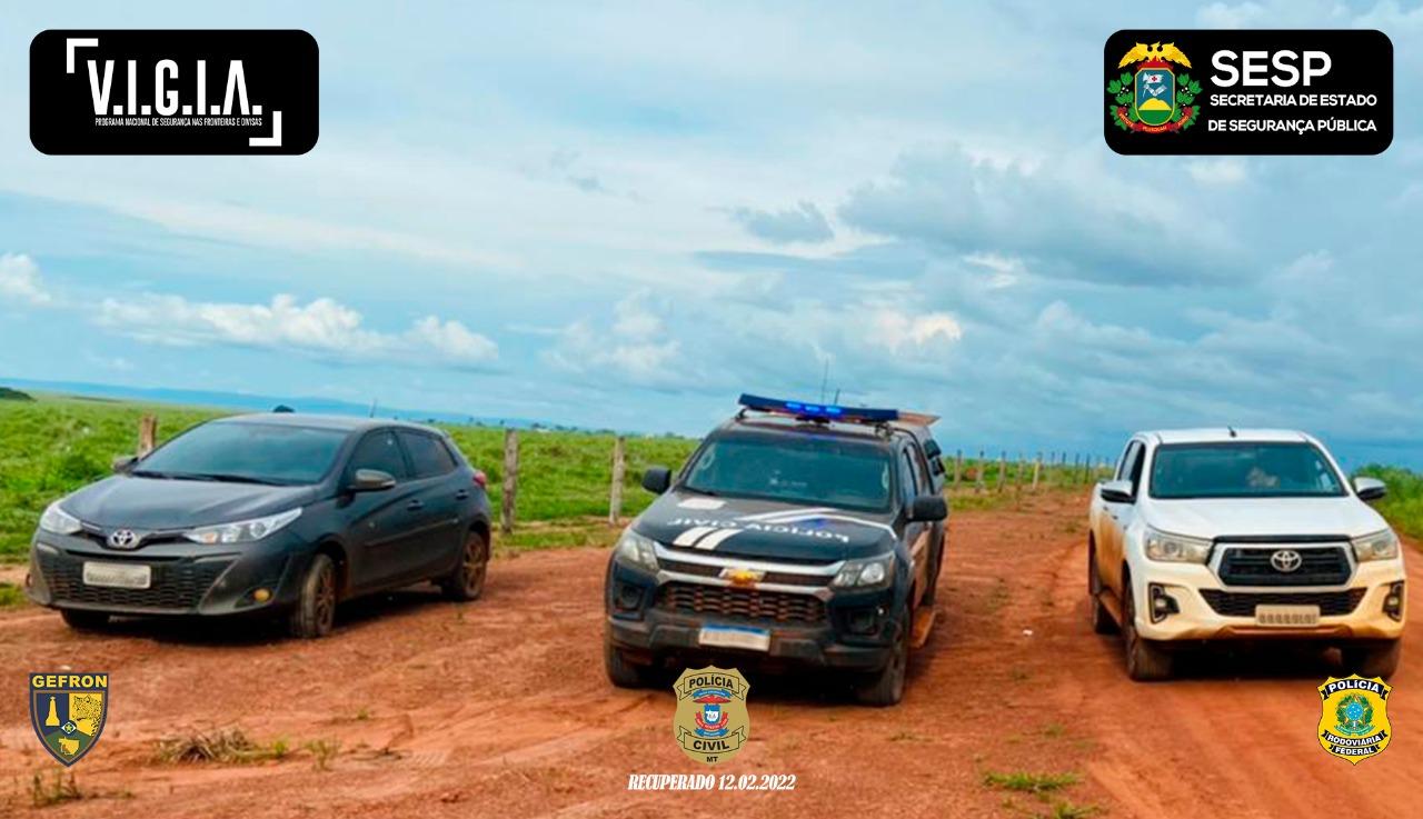 A equipe recebeu a informação que um veículo Toyota Hilux e um Toyota Yaris estavam em comboio seguindo possivelmente para a Bolívia. Os agentes da Polícia Civil se deslocaram para realizar abordagem e após checagem foi confirmado que se tratava de dois veículos produto de furto realizado em Cuiabá.