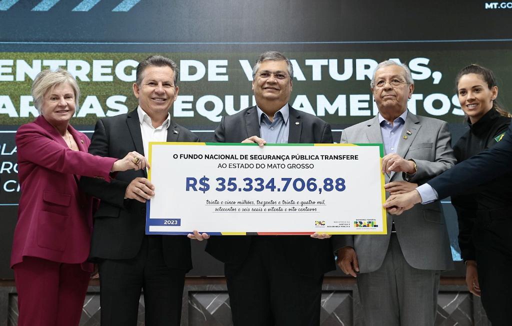 Mato Grosso também recebeu 30 viaturas, 12 caminhonetes e 18 veículos de radiopatrulhamento, 116 pistolas, 235 fardas de policiamento rural, nove drones, além de materiais de suporte e proteção individual, que totalizam cerca de R$ 9 milhões. Foram destinados também R$ 2,9 milhões ao Programa Escola Segura, cujo objetivo é investimento em prevenção à violência, rondas, qualificação de profissionais da área de segurança, pesquisas e monitoramento cibernético.