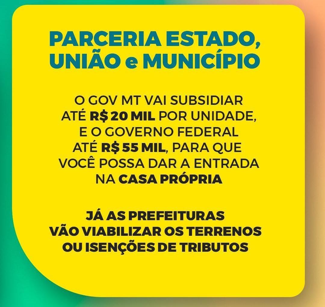 Para tornar as casas mais acessíveis, o Governo de Mato Grosso irá conceder subsídios de até R$ 20 mil para complementar o valor da entrada do financiamento, que será repassado diretamente para a Caixa Econômica Federal. Este é o maior subsídio disponibilizado entre todos os Estados para um programa habitacional.