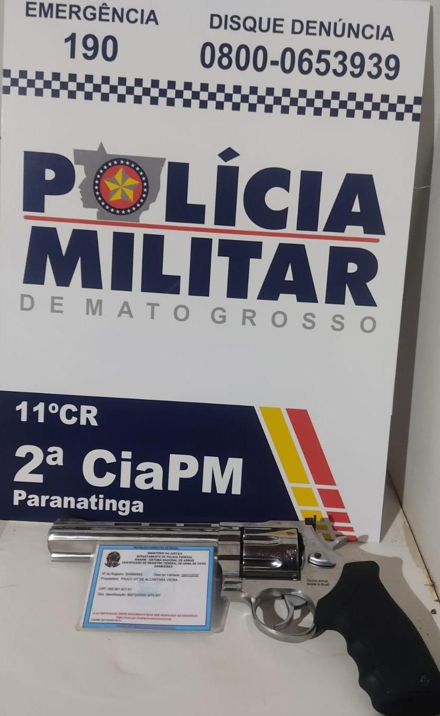 Ao chegar no local indicado, os policiais se depararam com o suspeito estacionando o seu veículo na garagem da residência, o mesmo foi abordado e em entrevista, foi confirmado que possuía uma arma de fogo, o suspeito apresentou sua arma bem como o registro, um revólver 357 marca Taurus com duas munições calibre 357.