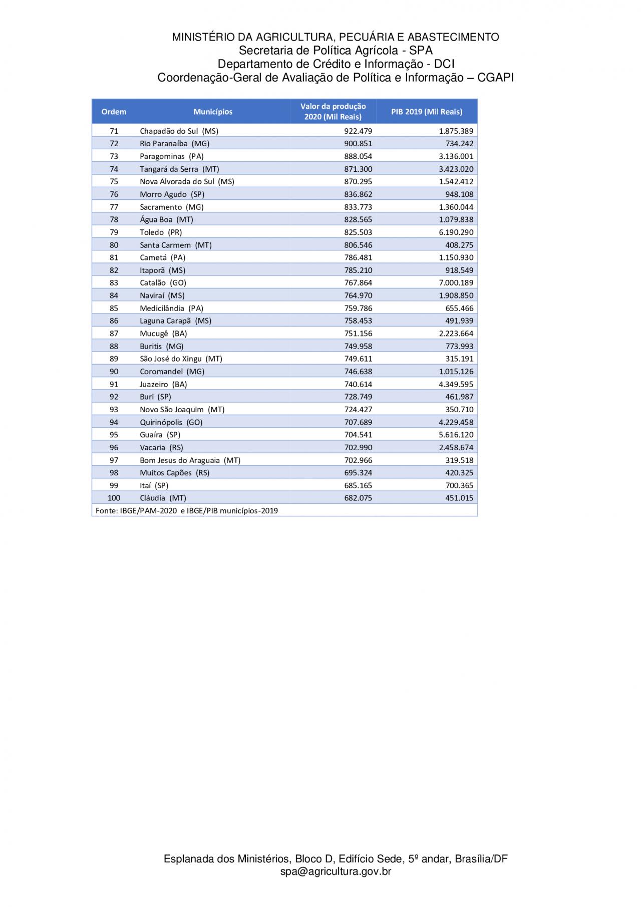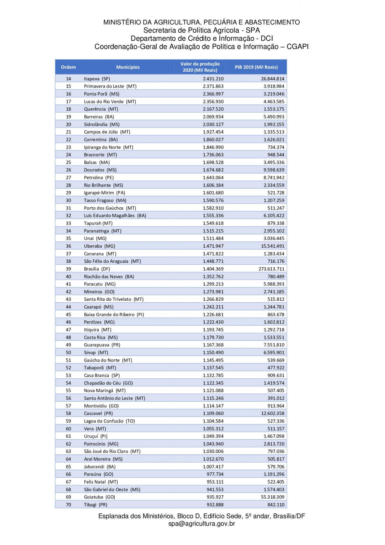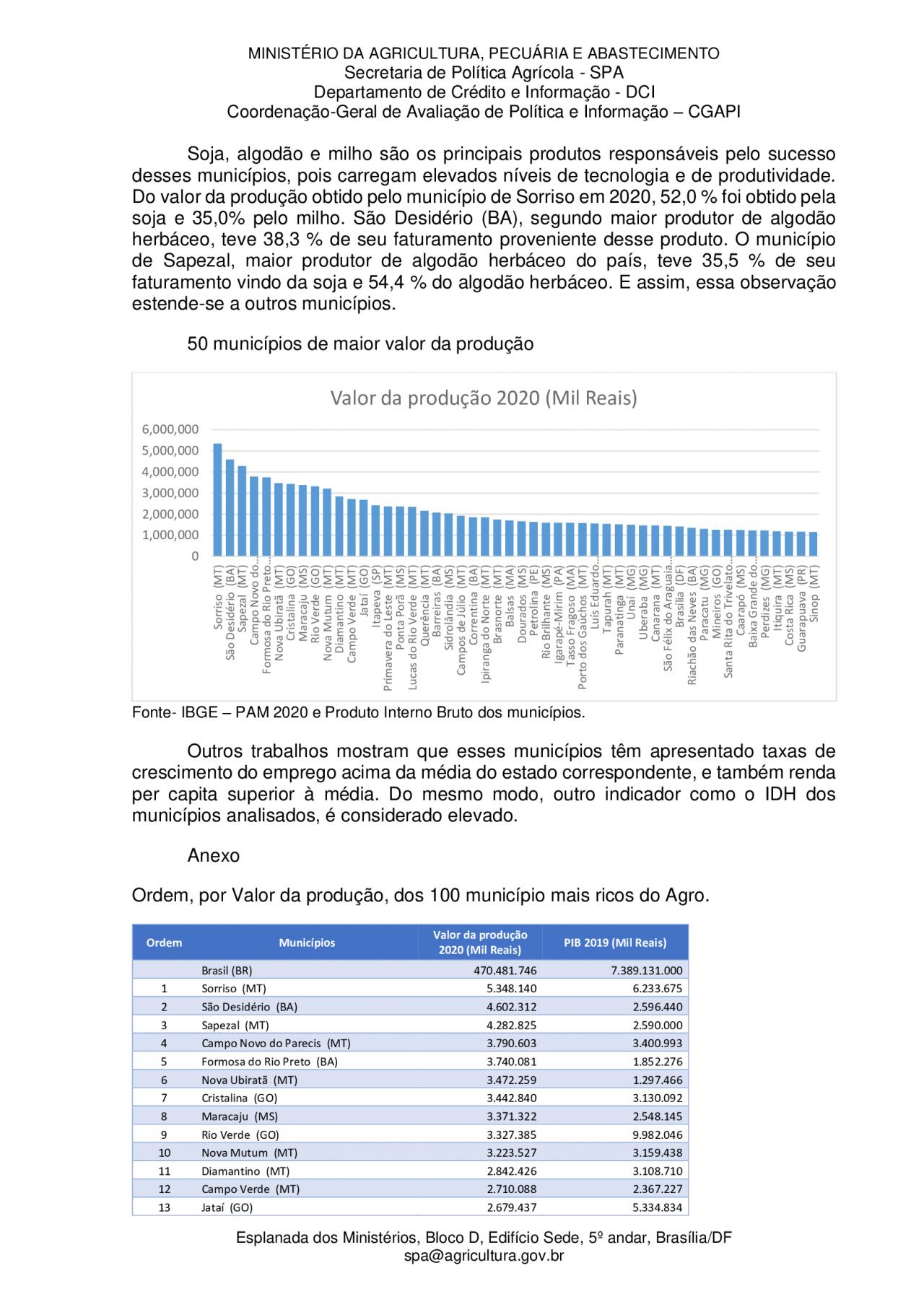 Segundo o Mapa, a maior parte dos municípios com maior valor da produção foi de Mato Grosso. Mas destaca a participação dos estados da Bahia, Goiás e Mato Grosso do Sul. Mato Grosso tem 35 municípios na lista, Bahia 9, Goiás 10, Mato Grosso do Sul 13, Minas Gerais 8, São Paulo 6. Os demais municípios estão distribuídos em Pernambuco (1), Maranhão (2) Pará (4), Distrito Federal (1), Piauí (2), Paraná (4), Tocantins (1) e Rio Grande do Sul (2).