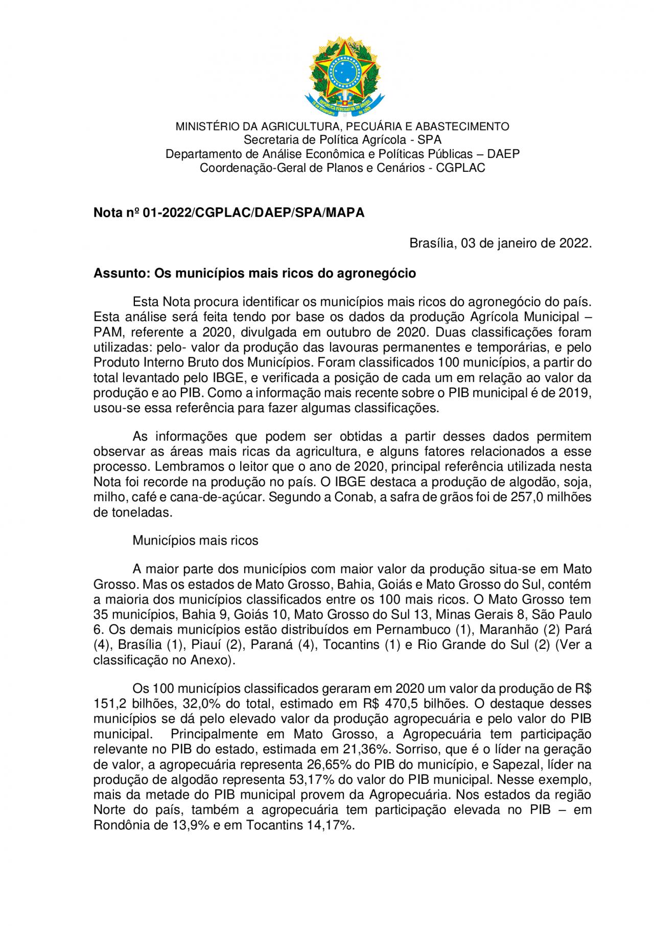 Ranking dos 100 municípios mais ricos do Brasil na produção do agronegócio elenca 35 municípios de Mato Grosso. O estado, inclusive, ocupa na primeira colocação o município de Sorriso. Dos R$ 470 bilhões comercializados em 2020 pelo país, a cidade do médio-norte mato-grossense foi responsável por R$ 5,3 bilhões, conforme os dados apresentados pelo Ministério da Agricultura Pecuária e Abastecimento (Mapa).