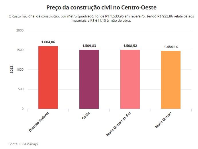 No Centro-Oeste, o custo médio, por metro quadrado, é de R$ 1.523,16. No Distrito Federal o valor é de R$ 1.604,06; em Goiás é de R$ 1.509,83; em Mato Grosso do Sul é de R$ 1.508,52 e em Mato Grosso o valor ficou em R$ 1.484,14.