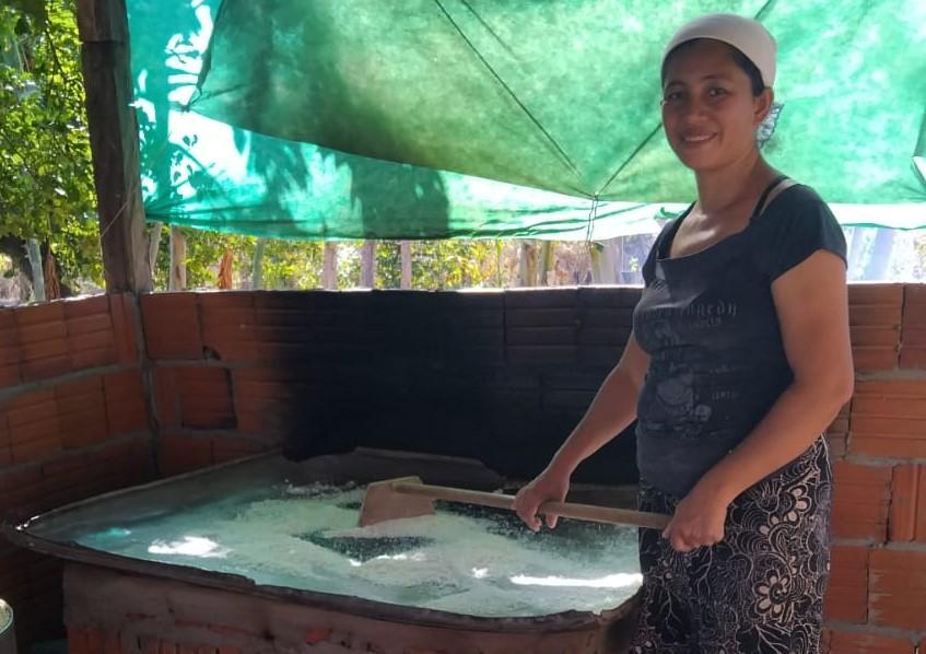Na comunidade Carioca, próxima à Mineira, Pedrina Ribeiro de Souza Silva planta mandioca e produz farinha. Seu projeto prevê a compra de um triturador forrageiro, uma balança e uma seladora.