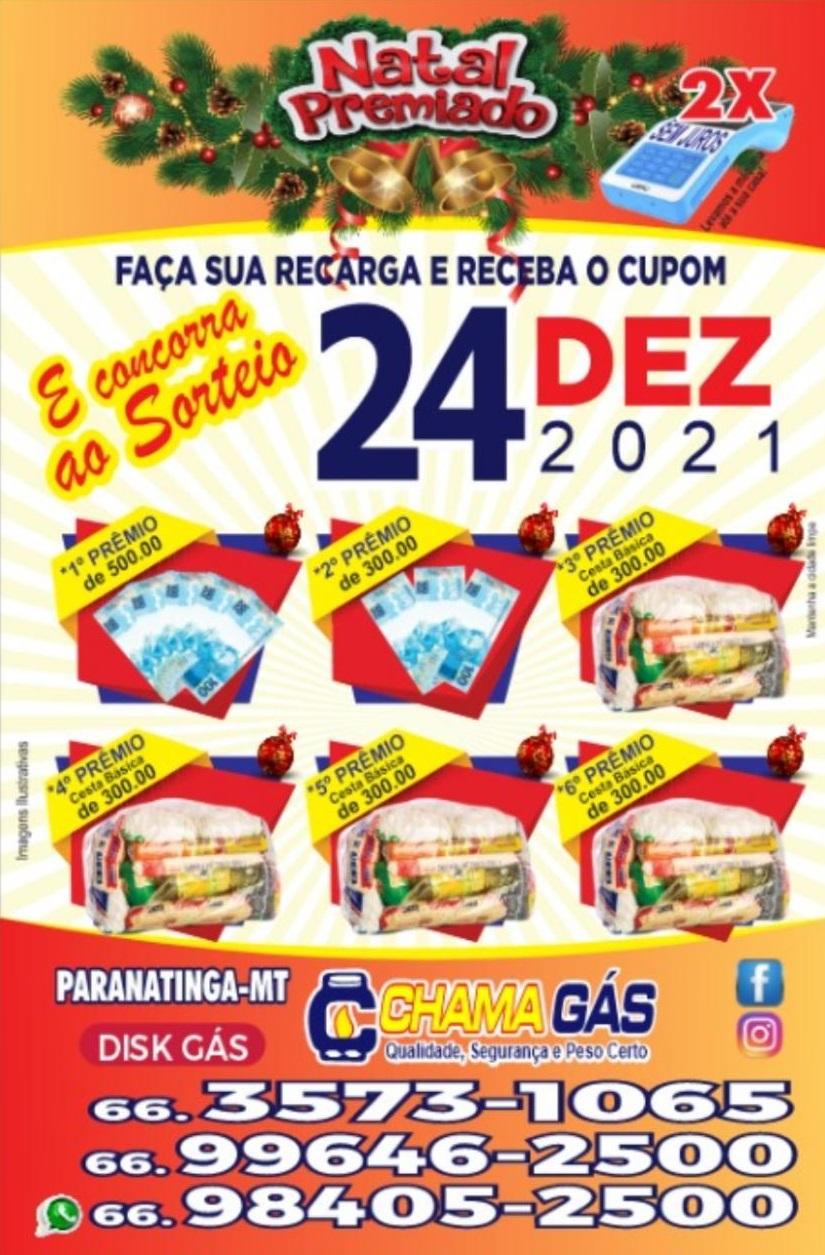 A Chama Gás vai sortear pra você cliente no dia 24 de Dezembro 02(dois) prêmios em dinheiro no valor de R$800,00 e 04 Cestas Básicas no valor de R$300,00, e ai vai ficar de fora? Não né, então aproveite e compre agora mesmo o seu gás ou água com a Chama Gás em Paranatinga.