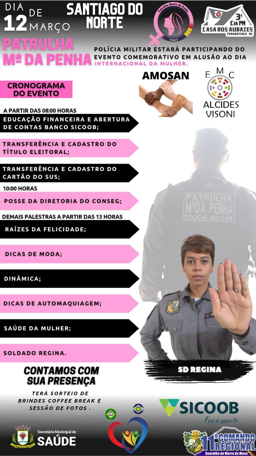 No próximo dia 12 de Março a PM tem mais uma missão em Santiago do Norte, aonde o assunto principal é a Patrulha Maria da Penha orientado pela Sd. PM Regina em parcerias.