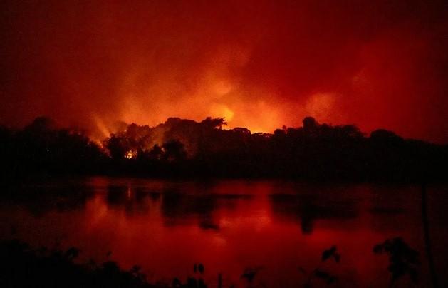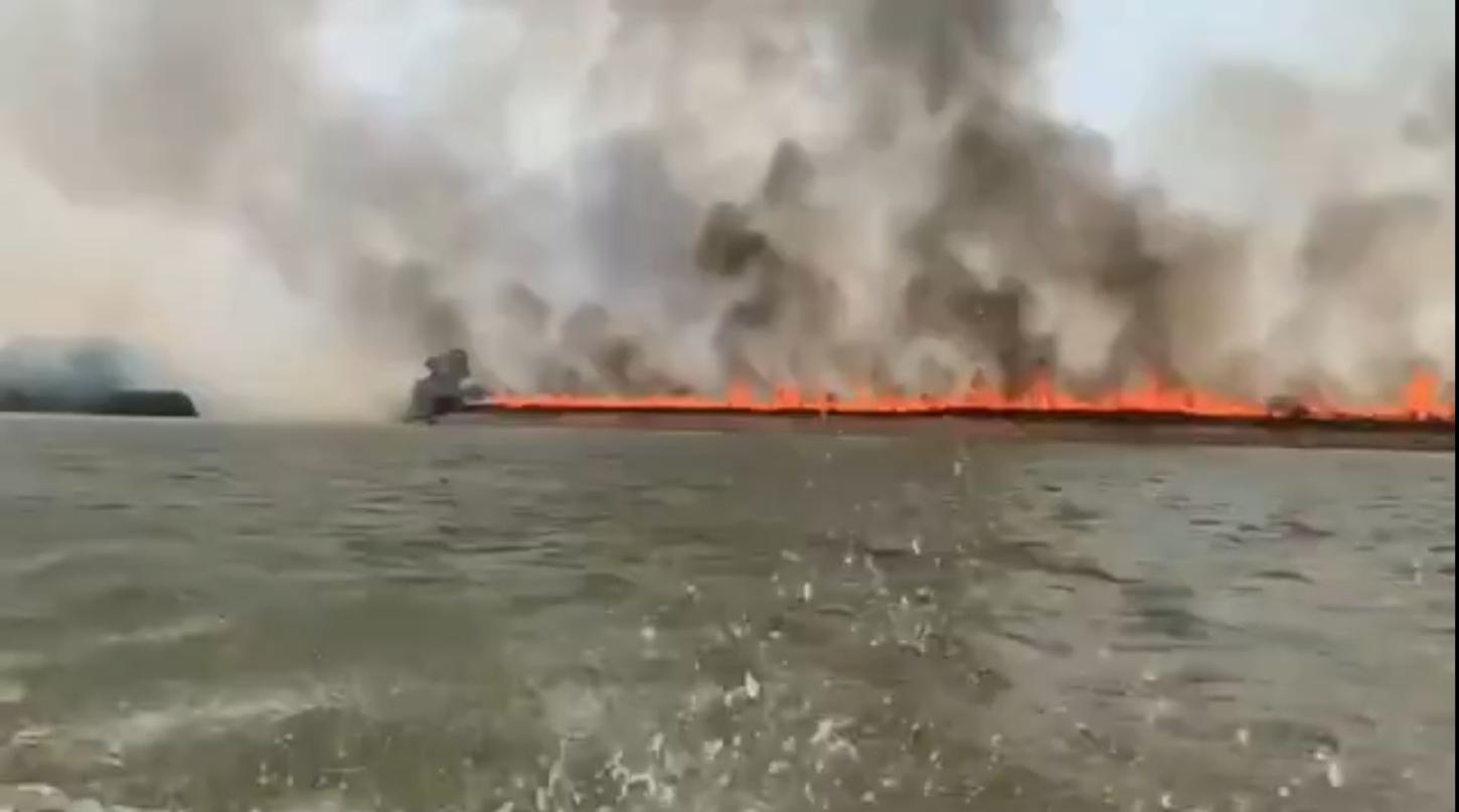 Brigadistas de Mato Grosso flagram paredão de fogo cobrindo as margens do rio Xingu