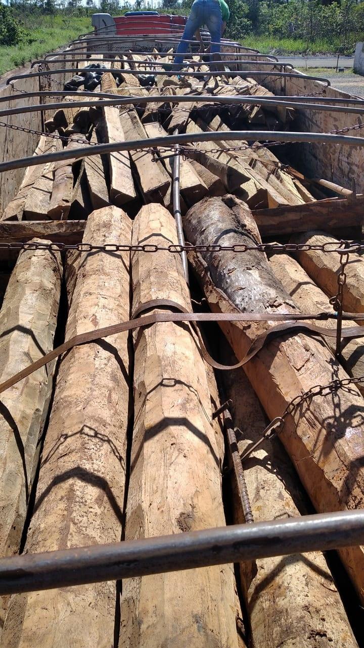 Após abordagem a guarnição da PM constatou que a carga transportada se tratava de lascas de madeira e palanques, após checagem ao motorista o mesmo apresentou uma nota que não condizia com a carga transportada e nem da região de origem da mercadoria.