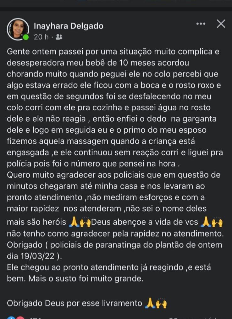 "Gente ontem passei por uma situação muito complica e desesperadora meu bebê de 10 meses acordou chorando muito quando peguei ele no colo percebi que algo estava errado ele ficou com a boca e o rosto roxo e em questão de segundos foi se desfalecendo no meu colo corri com ele pra cozinha e passei água no rosto dele e ele não reagia , então enfiei o dedo na garganta dele e logo em seguida eu e o primo do meu esposo fizemos aquela massagem quando a criança está engasgada ,e ele continuou sem reação corri e liguei pra polícia pois foi o número que pensei na hora .