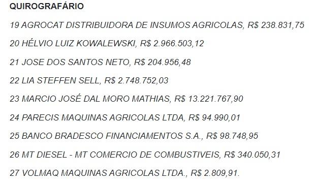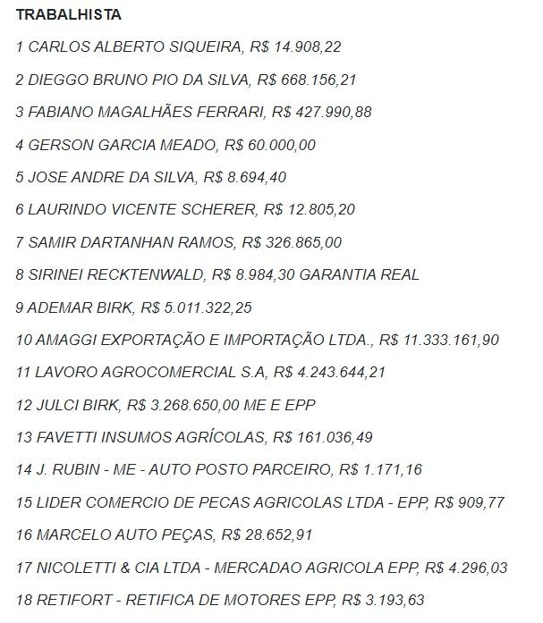Um despacho da 4ª Vara Cível de Sinop, do último dia 23 de junho, revela que os principais credores do produtor rural são a Amaggi Exportação e Importações e a Birck - empresa de Santa Catarina que fornece peças de substituição para máquinas agrícolas.