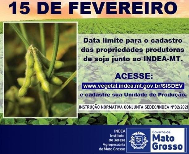 Conforme a Instrução Normativa Conjunta SEDEC/INDEA-MT nº 002/2021, de 07 de dezembro de 2021, o cadastramento ou a atualização do cadastro da unidade de produção de soja deve ser realizado, anualmente, até 15 de fevereiro, informando todos os dados solicitados no cadastro e as coordenadas geográficas da lavoura.