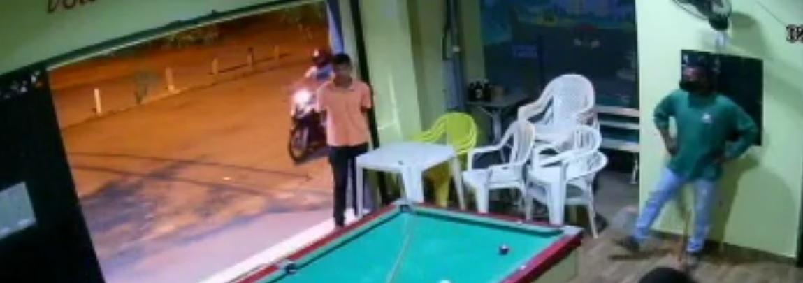 Nesse momento, o outro homem que estava na porta também saca a arma e dá um tiro em direção ao interior do bar e atinge uma mesa de sinuca e quase acerta os clientes que estavam no local.