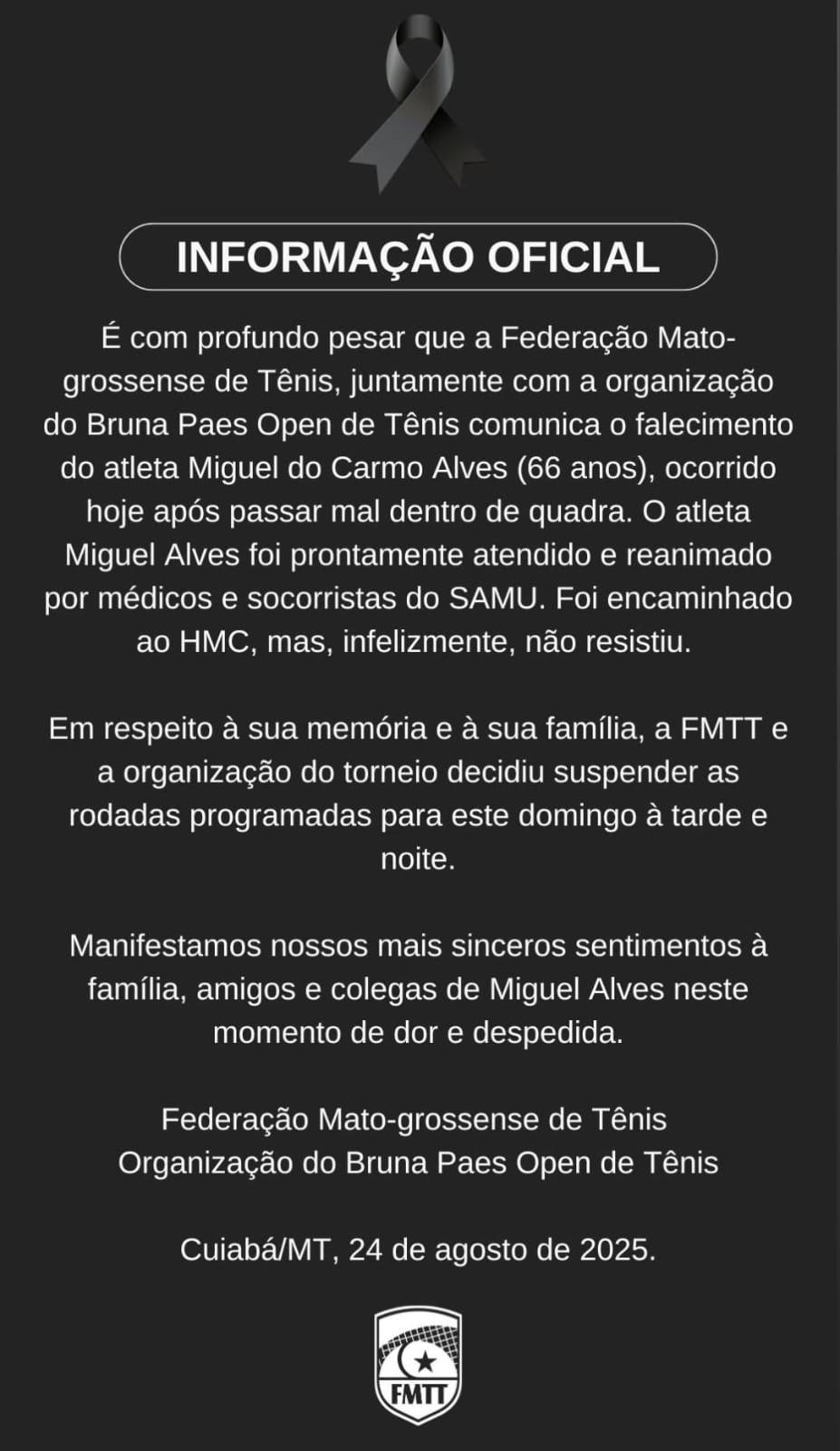 O tenista Miguel do Carmo Alves, de 66 anos, morreu após passar mal durante um torneio realizado em Cuiabá, na manhã deste domingo (24). A informação foi confirmada pela Federação Mato-grossense de Tênis (FMTT).