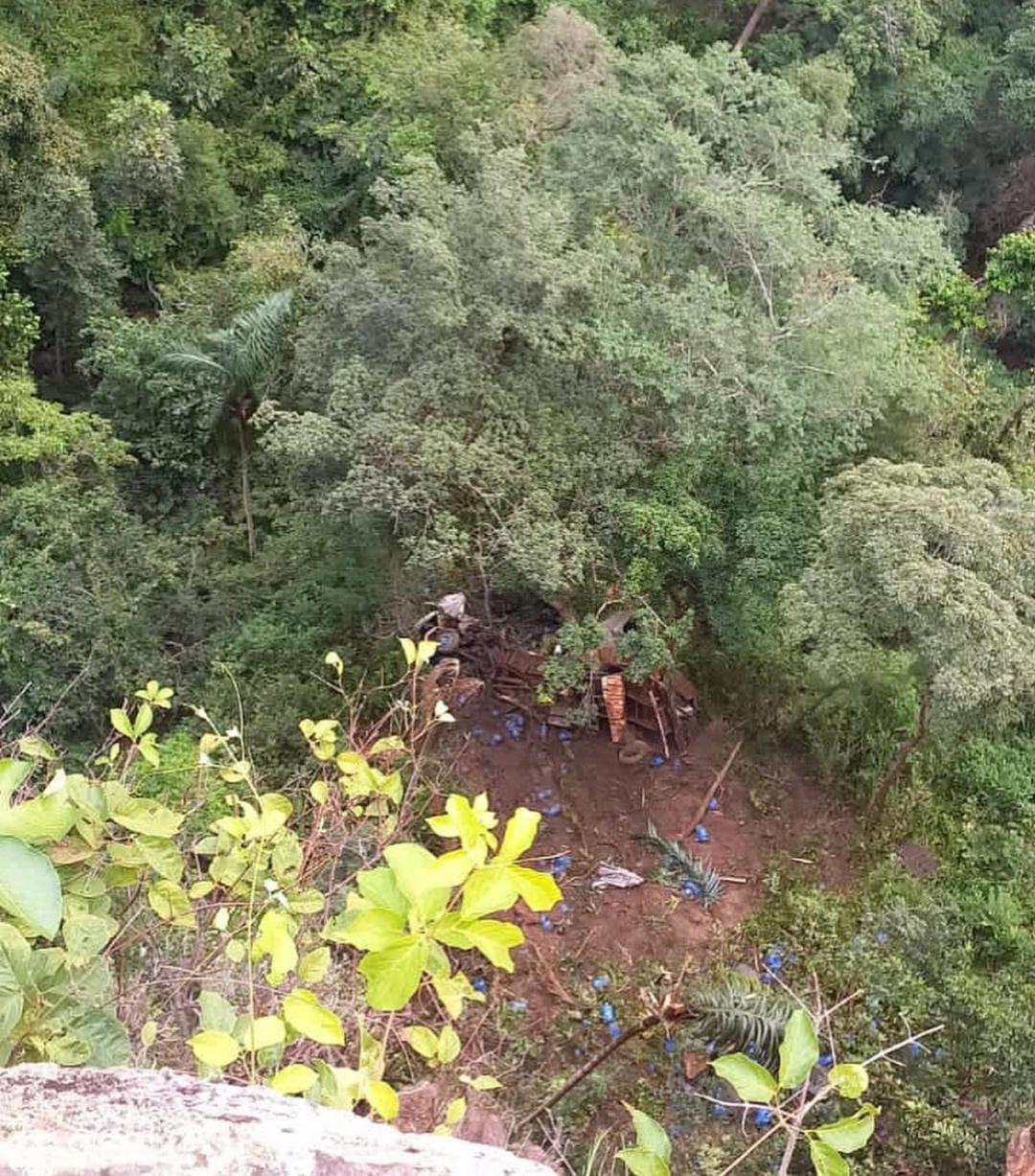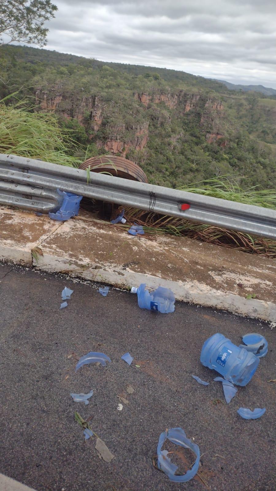Na sequência, o veículo descontrolado, rompeu a barreira entre a pista e o precipício.