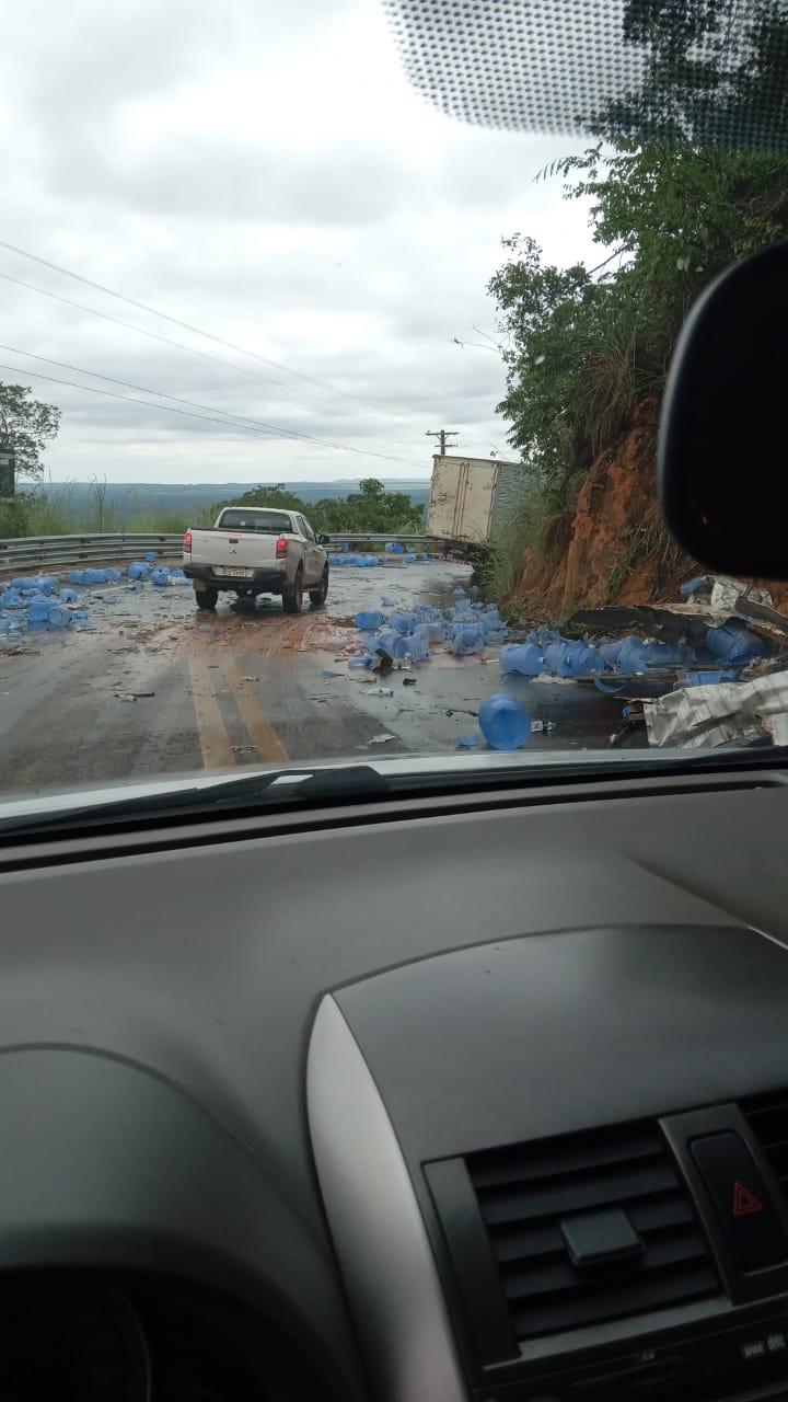 O caminhão estava carregado de garrafas de água mineral. Várias garrafas foram espalhadas na rodovia.