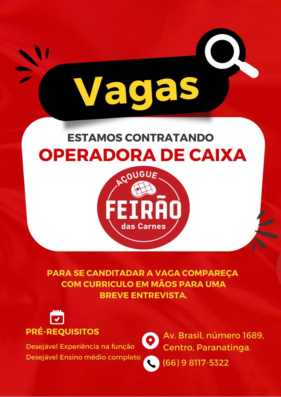 Interessado na vaga devem ir até o local na Av. Brasil, 1689 no Centro de Paranatinga, em frente a Padaria do Ito